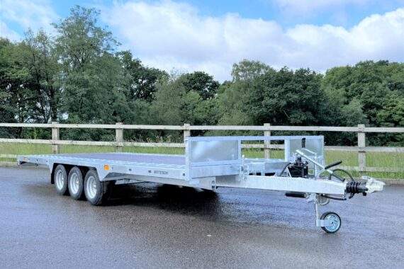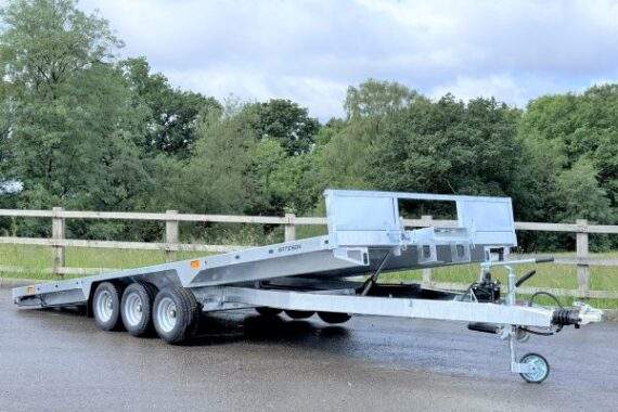 The PT56 is the most popular model in the range, it is a true multi purpose trailer without compromise. The low deck height and hydraulic tilt makes loading machines and cars safe and easy. The three axles are rated at 1500 kg each (4.5 tons total). The trailer is plated at the legal maximum of 3500 kg. gross but can be plated down for use with vehicles with a lower permitted train weight.